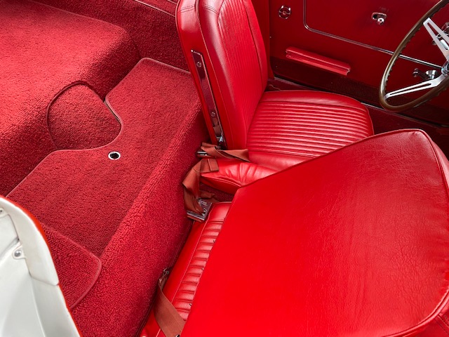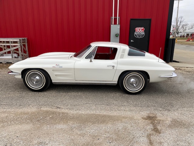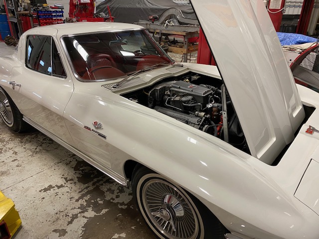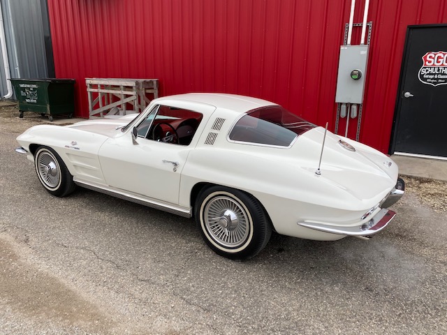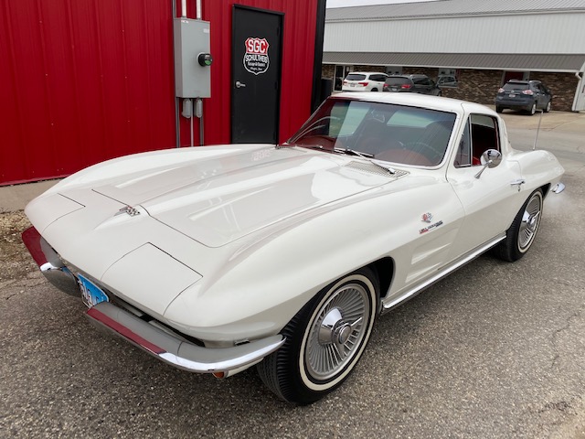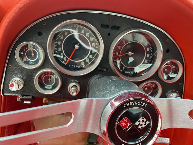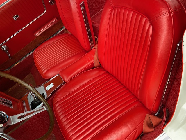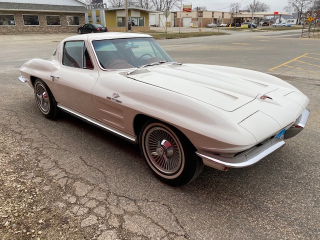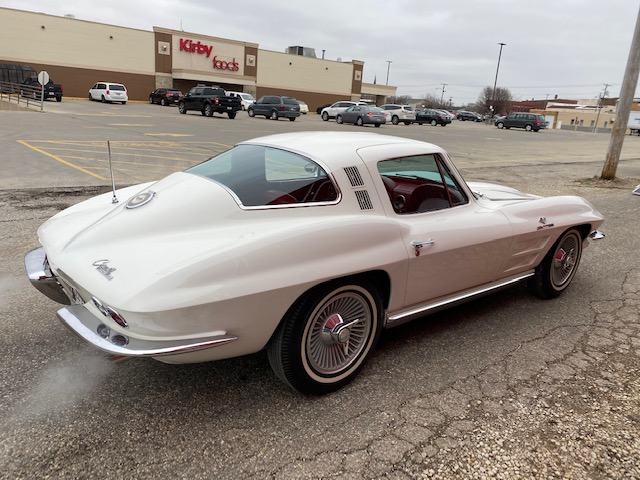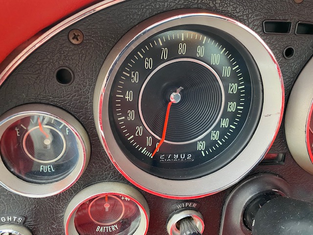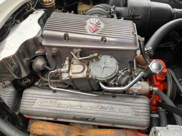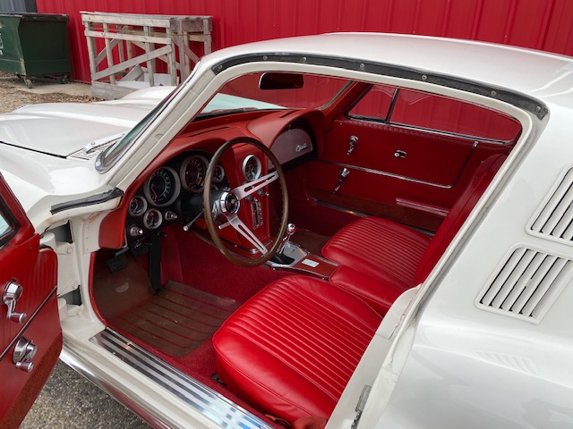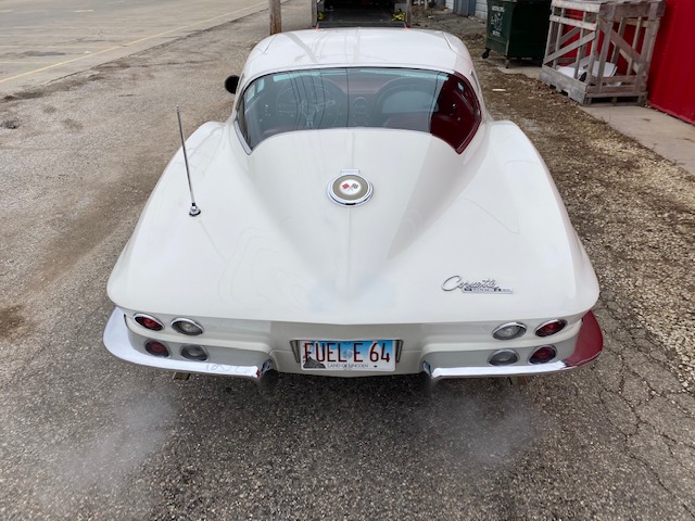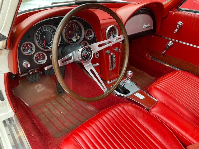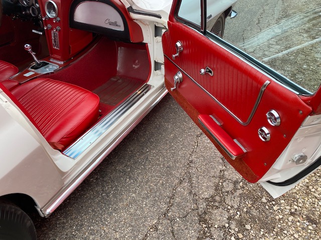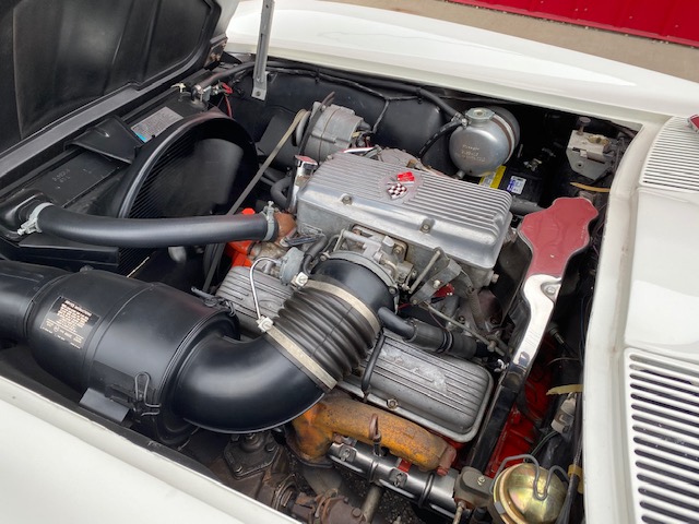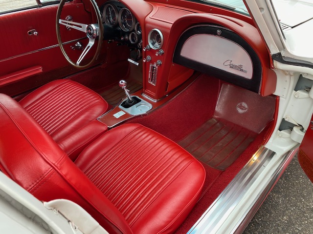 This one is very original and maintains its original numbers matching engine, four speed manual transmission, and the original Rochester Fuel Injection unit. This car is in remarkable condition and drives incredibly well, and it is even more remarkable that it is in original unrestored condition except for one repaint in the original Ermine White over a stunning red interior. The frame is in excellent condition without any rot or structural issues. It also has its original AM-FM radio and 4.11 rear end. Even the radiator is the original correct date coded piece. The car has been maintained in an unmolested and original condition that does not show its age. It is readily apparent the car has been painstakingly cared for through the years. The odometer shows only 27,9xx miles which are believed to be accurate especially based on the remarkable condition and obviously sparing use the car has seen since 1964. It has Western reproduction knock off Aluminum wheels with correct white line tires that are in great condition as well.